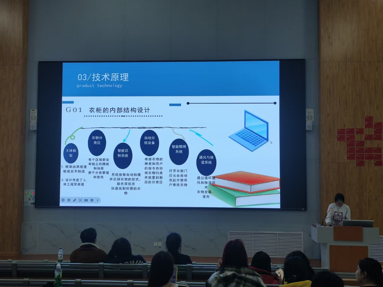 来自不同年级专业的25支队伍、近100名同学参与了此次初赛。参赛作品丰富多彩,涵盖了传统文化、科技创新以及生活创意等多个领域。非遗鲁南柳琴戏、鲁南花鼓、鲁绣文创、青花瓷DIY传承文化根脉;智能分类衣柜、智能井盖、湿地流沙、智能调节灯展现科技魅力;二十四节气中医药奶茶、MIUMIU椅、智能药盒、农业监测无人机、叫醒眼罩尽显创新巧思。比赛采取路演竞演的形式进行,各参赛队伍轮流上台展示作品。