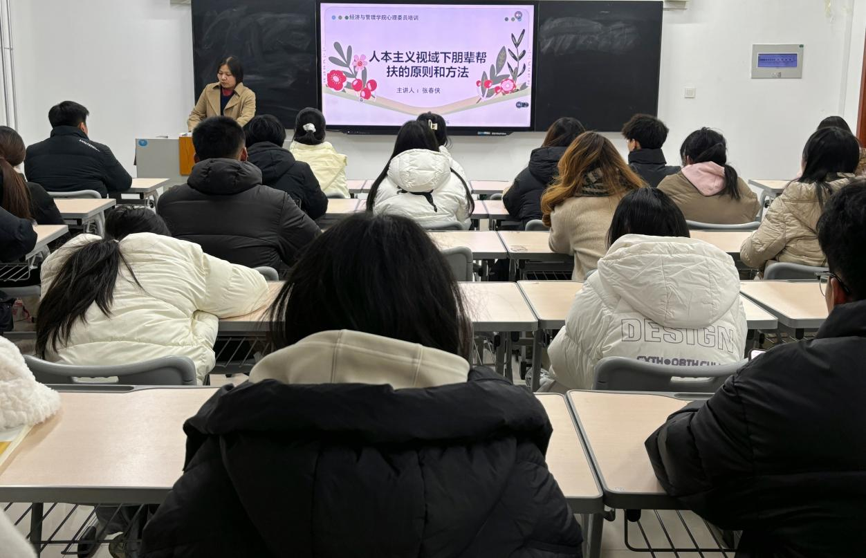 为增强老员工心理健康意识,提升心理委员朋辈帮扶能力,营造友好互助的育人环境,db真人体育官网于2024年3月6日在豁然楼A317举行《人本主义视域下朋辈帮扶的原则和方法》培训。本次培训由张春侠老师主讲,全体心理委员参加。