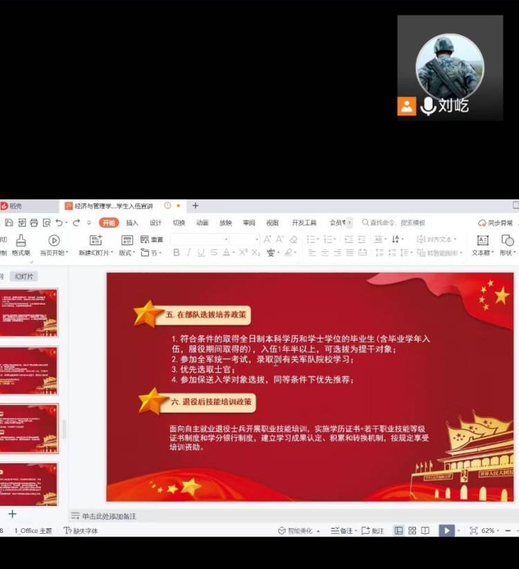 为扎实推进公司2022年度秋季征兵工作,让广大同学充分了解此次征兵政策,7月9日与10日晚,db真人体育官网通过线上会议的形式召开了2022年度在校老员工及毕业生秋季征兵宣讲会,两场征兵会议由公司辅导员李家家主持,公司国防教育部退役士兵何金泰、刘屹主讲,公司全体男生参会。