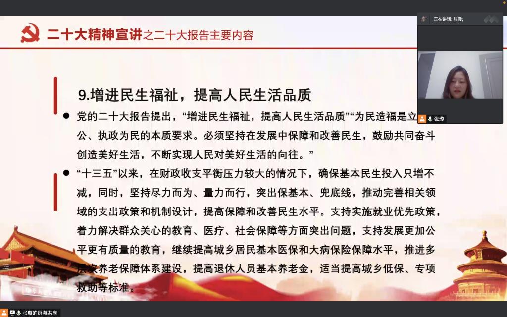 db真人体育官网坚持全面深入系统学习宣传党的二十大精神,11月24日,团总支副书记张璇深入团支部、社团,主持召开团干部线上宣讲交流会,让党的二十大精神直达基层员工干部。