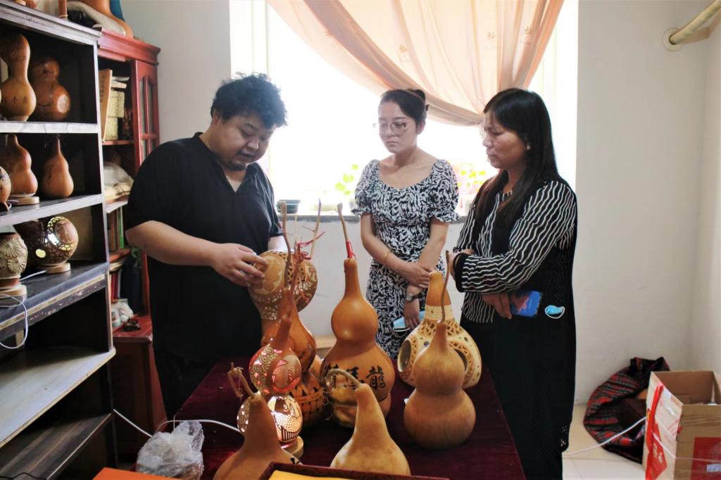 非遗传承人王超详细介绍了非遗保护项目烙画葫芦的传承现状。在工作室中,大家见到了许多制作精良的烙画、雕刻葫芦作品,其中不乏有许多大赛获奖作品及专利作品。