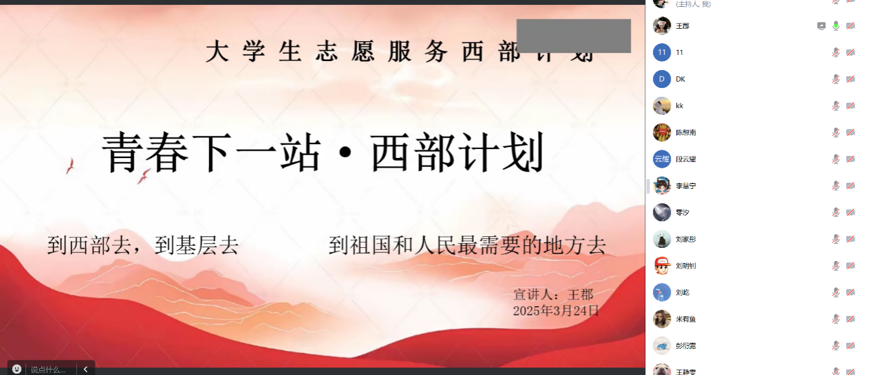 为积极响应国家鼓励青年投身西部建设的号召,引导更多毕业生到西部基层去建功立业,3月24日,db真人体育官网在腾讯会议举办2025年西部计划云宣讲会。此次宣讲会邀请了2024届西部计划志愿者代表为员工们进行经验分享,为有志于投身西部建设的学子们提供了全面了解西部计划的窗口。本次宣讲会由辅导员殷凯主持。