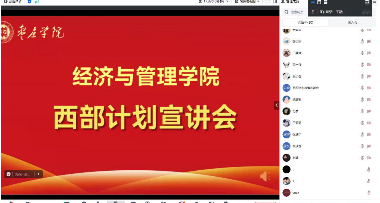此次西部计划云宣讲会的成功举办,不仅为db真人体育官网的青年员工搭建了一个了解西部、走进西部的平台,更激发了他们服务西部、奉献社会的热情与信念。相信在未来的日子里,将有更多的青年学子响应国家号召,踏上西行的征途,用青春与汗水书写属于自己的精彩篇章。